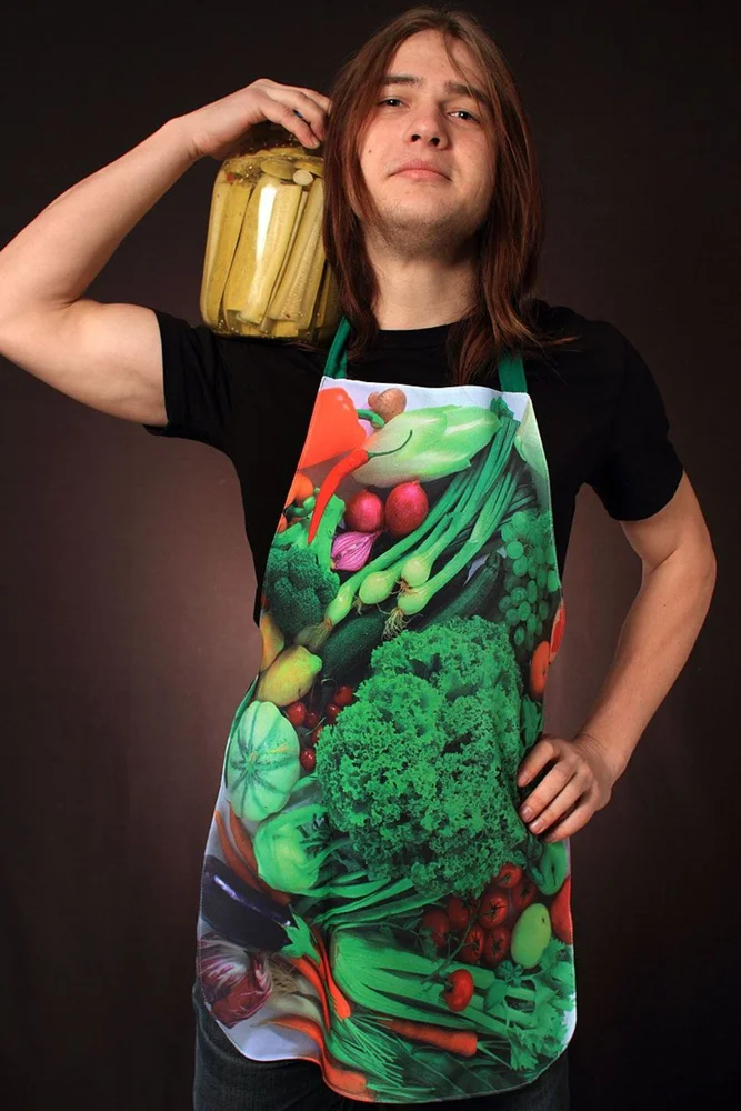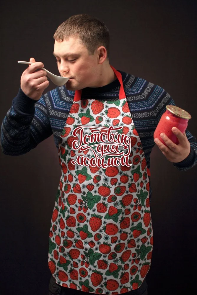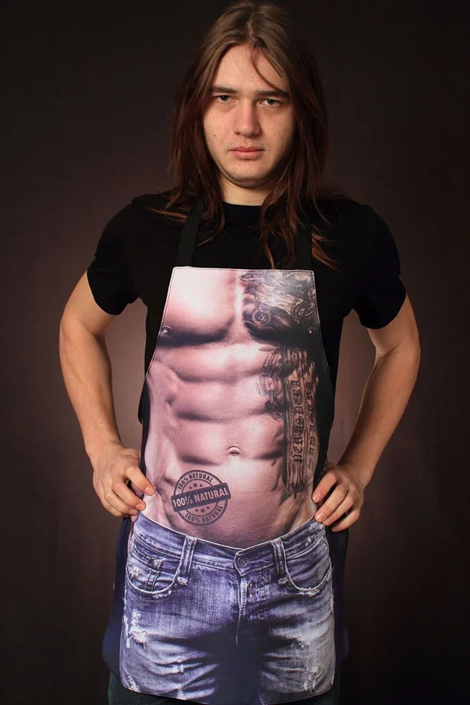 - Принадлежит к категории «унисекс». То есть фартук могут носить как мужчины, так и женщины. Уже отталкиваясь от половой принадлежности, можно подобрать наиболее подходящий рисунок.
